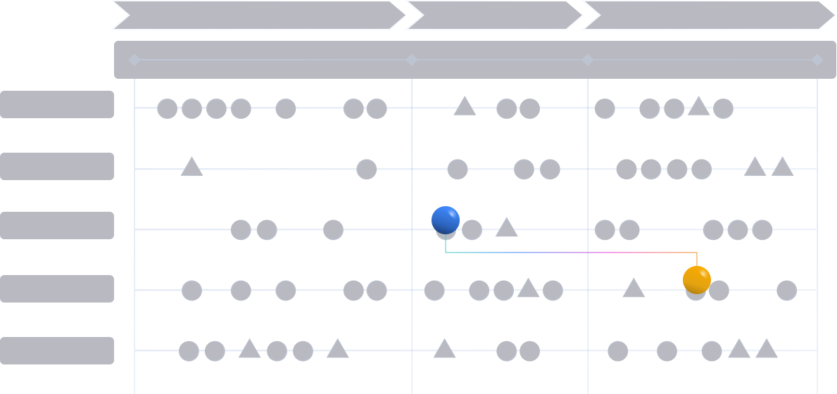 Im nächsten Schritt müssen die Vorgänger- und Nachfolger-Eckpunkte miteinander verknüpft werden, um eine Prozesskette zu erstellen. Durch diese Verknüpfungen wird ein visueller Ablauf zwischen den Eckpunkten hergestellt, sodass deutlich erkennbar wird, welcher Eckpunkt von welchem abhängt. Dieser Schritt sorgt dafür, dass die Abhängigkeiten im Projekt klar strukturiert und nachvollziehbar dargestellt werden, was eine effiziente Projektsteuerung ermöglicht.